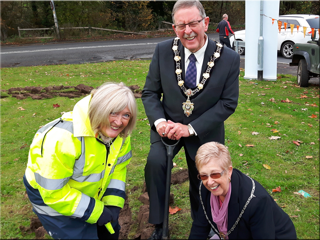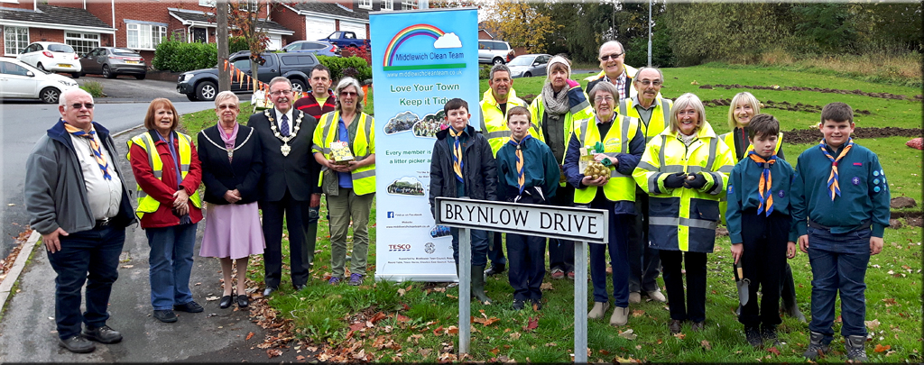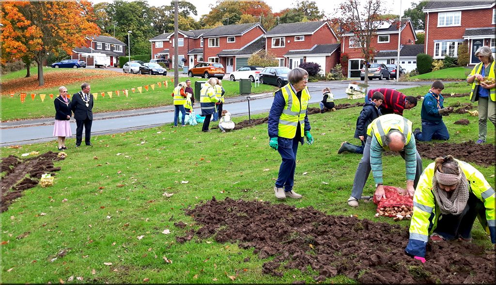 Middlewich’s Mayor Ken Kingston and his consort Sue Johns presided over events as the enthusiastic volunteers of all ages got to work planting the bulbs in the rows of prepared holes.